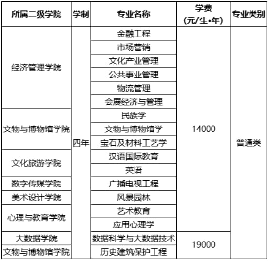 金融工程、市场营销、文化产业管理、公共事业管理、物流管理、会展经济与管理、民族学、文物与博物馆学、宝石及材料工艺学、汉语国际教育、英语、广播电视工程、风景园林、应用心理学、艺术教育、数据科学与大数据技术、历史建筑保护工程本科专业;金融服务与管理、大数据与财务管理、会展策划与管理、中文、数字媒体技术专科专业,只需参加全国普通高等学校招生统一文化考试。