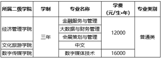 学校专业设置适应当下社会需求,切合学校发展,涵盖艺术学、经济学、法学、教育学、文学、历史学、工学和管理学八大本科学科门类与文化艺术、新闻传播、资源环境与安全、土木建筑、财经商贸、旅游和教育与体育七大专科学科门类,涉及音乐与舞蹈学类、戏剧与影视学类、美术学类、设计学类、金融学类、民族学类、教育学类、中国语言文学类、外国语言文学类、历史学类、材料类、电子信息类、建筑类、工商管理类、公共管理类、物流管理与工程类、旅游管理类、艺术设计类、表演艺术类、广播影视类、资源勘查类、建筑设计类、金融类、财务会计类、市场营销类、旅游类、会展类、语言类、文秘类和体育类等三十个本、专科专业类别。